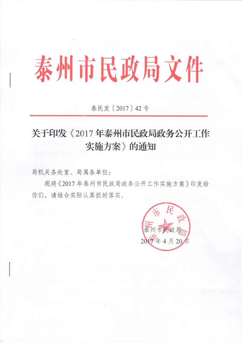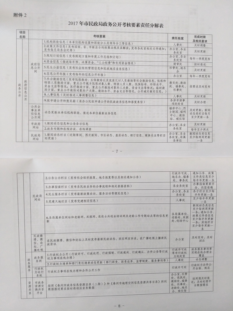 2017年我局按照《市政府办公室关于印发泰州市2017年政务公开工作要点的通知》(泰政办发〔2017〕86号)文件要求,2017年上半年我局制定了《泰州市民政局推进社会救助信息公开工作实施方案》和《泰州市民政局政务公开工作实施方案》,明确了信息公开内容和具体要素以及信息公开的形式,将信息公开内容按要素进行责任分解并纳入绩效考核。强化了信息公开的监督,保障了信息公开内容的及时、主动、准确、高效。