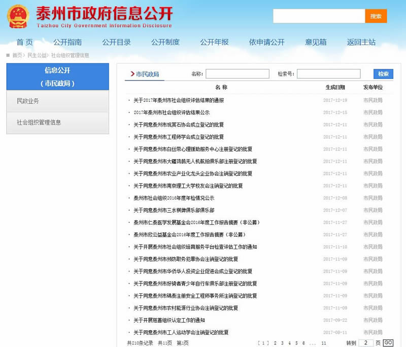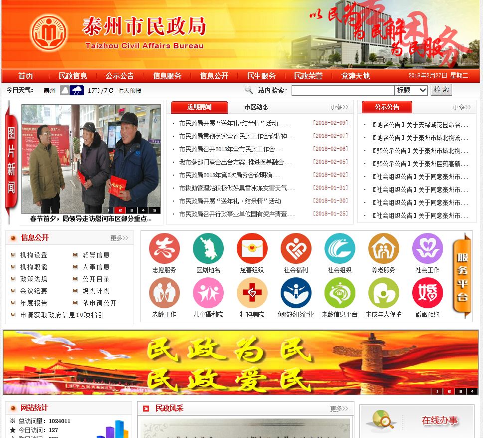 2017年泰州市民政局共在政府信息公开网站主动公开信息277条,各局属企事业单位在企事业信息公开网站公开信息137条,所有信息均及时规范。另外还通过民政局门户网站以及政务微博、“泰州民政”微信公众号等平台主动发布信息两千多条。