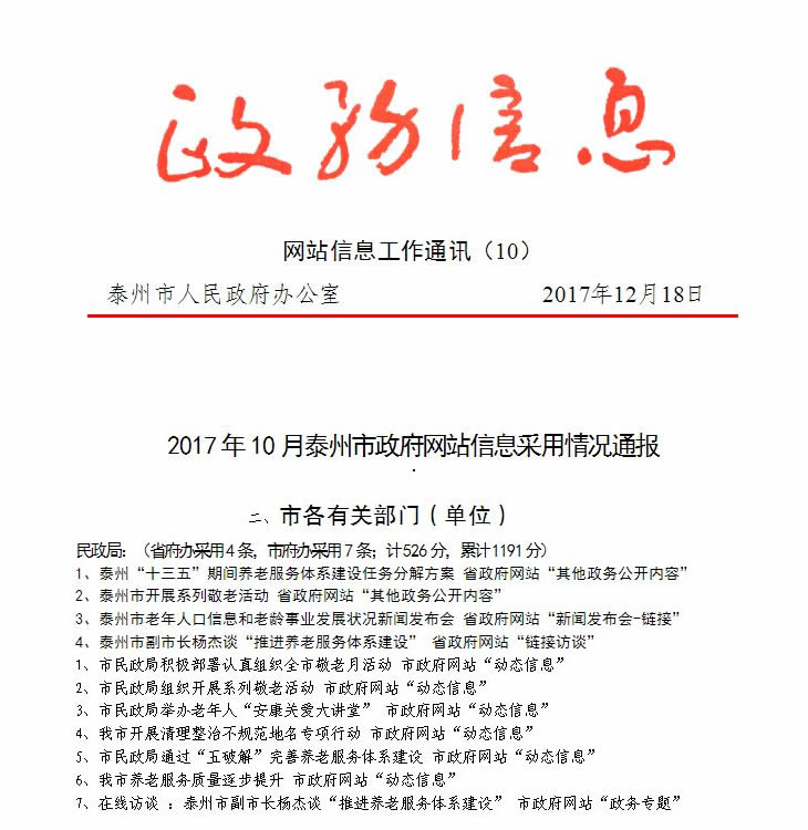 2017年市民政局网站共发布信息1523条,市政府网站采用动态信息147条。截止10月底民政局在政府网站内容保障信息得分已达1191分。