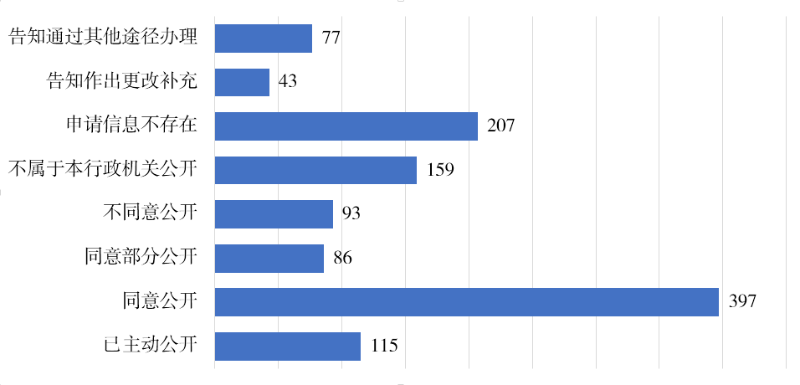 全年答复政府信息公开申请1177件,其中属于"已主动公开"115件,占比9.77%;"同意公开"397件,占比33.73%;"同意部分公开"86件,占比7.31%;"不同意公开"93件,占比7.9%;其余"不属于本行政机关公开"、"申请信息不存在"、"告知作出更改补充"、"告知通过其他途径办理"的共计486件,占比41.29%。