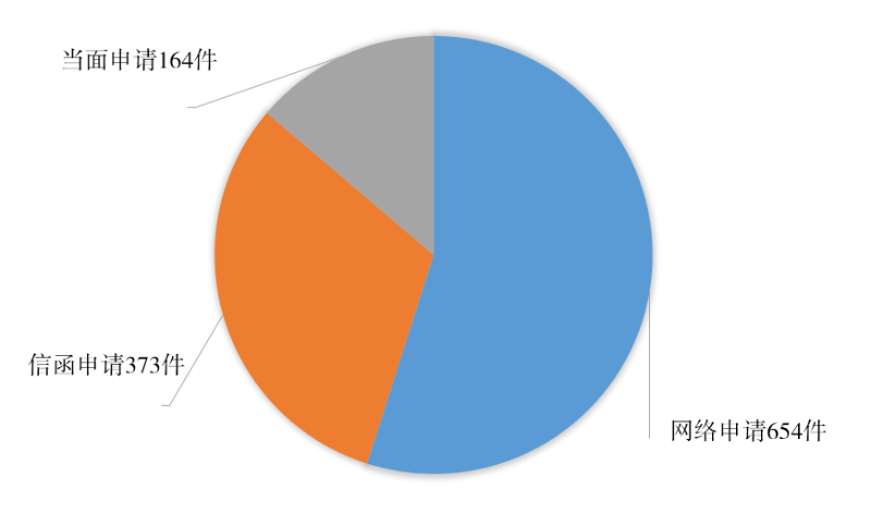 从申请来源看, 网络、信函、当面申请量分别为654件、373件、164件,占比分别为54.91%、31.32%、13.77%。