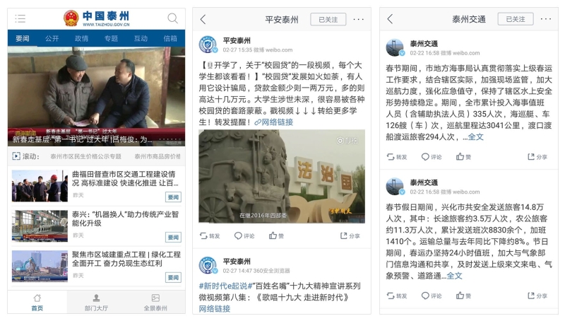 微博微信等新媒体。积极运用政务微博、微信、政务APP等新媒体公开各类政府信息32293条,发挥传递权威信息、回应社会舆情重要作用,其中"中国泰州微门户"、"平安泰州"、"泰州交通"等平台公开量位居前列。