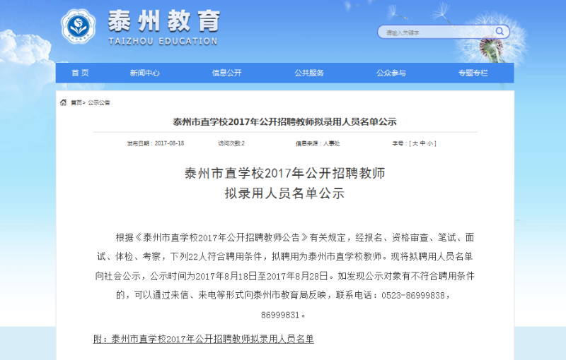 推进教育信息公开。教育督导方面,扎实有序开展县级政府教育工作和幼儿园规范办园行为、全市义务教育"全面改薄"等专项督查,及时公示督导报告;教育公共服务方面,多次组织新闻发布会、记者见面会、媒体集中采访活动,通过《泰州日报》、泰州电视台和网络媒体,就中考招生改革、学区划分、学生体质健康、学校食堂、幼师待遇等热点问题,发布教育信息;教育资金使用方面,推行学校财务公开制度,加大对学生资助政策、资助项目申请和认定流程、家庭经济困难学生认定结果和资助资金发放等信息公开力度;教育重大项目建设方面,对市二中整体搬迁和周山河小学、初中建设规划等重点工程,持续跟进项目进度、及时公开项目信息。