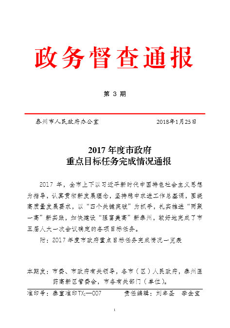 根据《中华人民共和国政府信息公开条例》规定,现公布泰州市人民政府2017年政府信息公开工作年度报告。报告所列数据的统计期限自2017年1月1日起至12月31日止,报告电子版可在泰州市政府门户网站(http://www.zztaojie.com)下载。如对报告有疑问,请与泰州市人民政府办公室政府信息公开处联系(地址:泰州市海陵区凤凰东路58号;邮编:225300;电话:0523-86839755;传真:0523-86839056;电子邮箱:zfbdzzwc@163.com)。